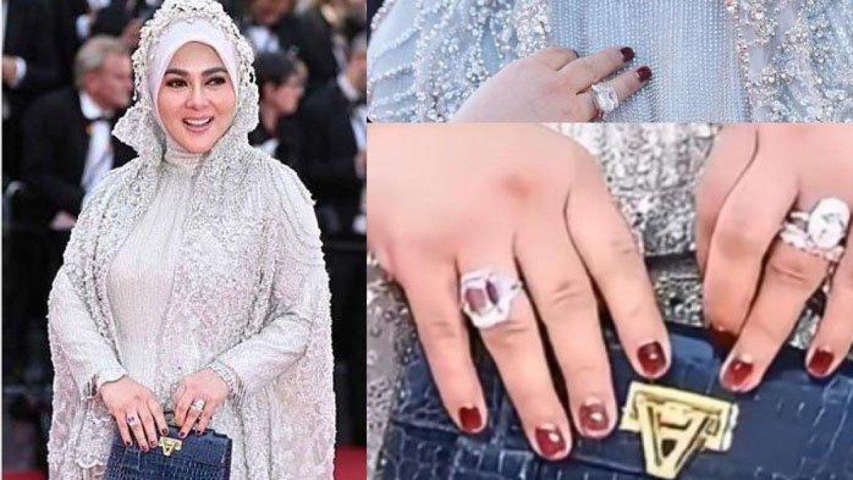 Tampillannya menjadi lebih mewah dengan penambahan hiasan yang mencolok pada kedua tangannya. Dia memakai serangkaian cincin berlian, gelang, dan jam tangan mahal yang menambahkan pesona elegantnya.