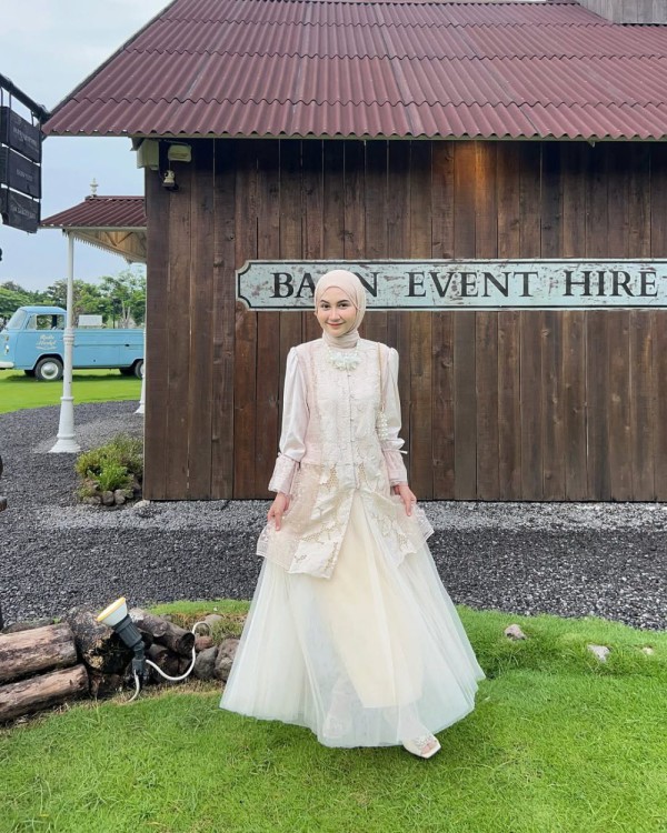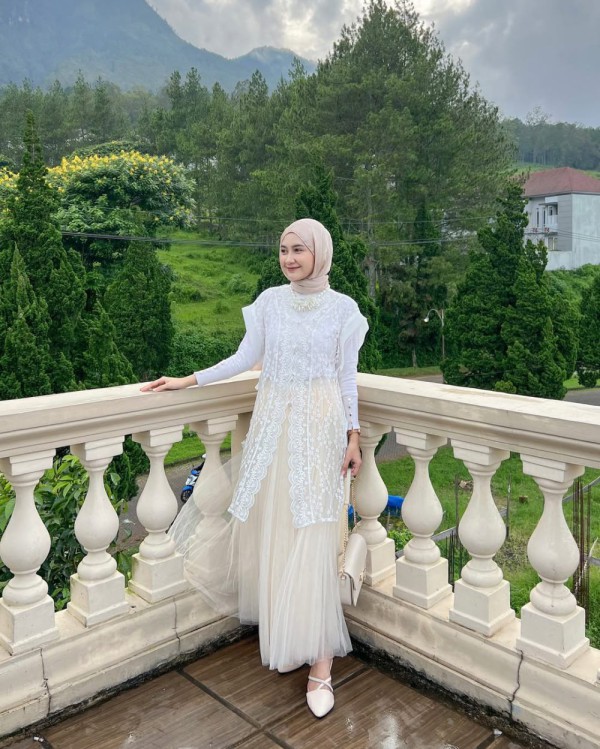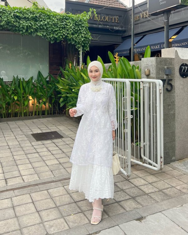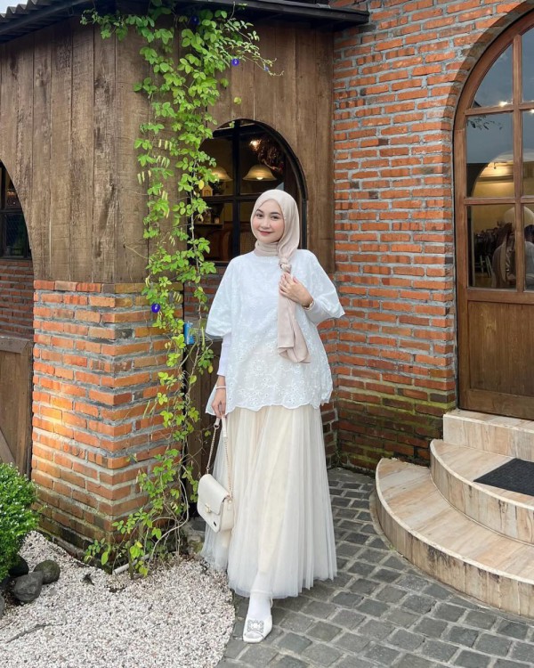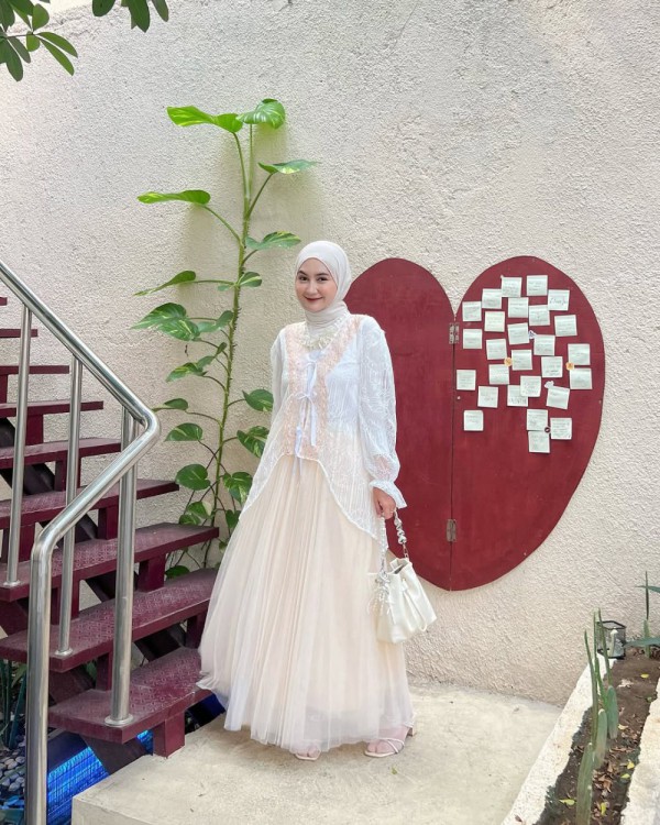 7. Pilih rok dengan motif lusuh warna putih patah kemudian gunakan tunik putih yang dipadukan dengan brukat berwarna krim. Agar tampilan makin menggemaskan, tambahkan high heels serta tas tangan sebagai pelengkapnya.